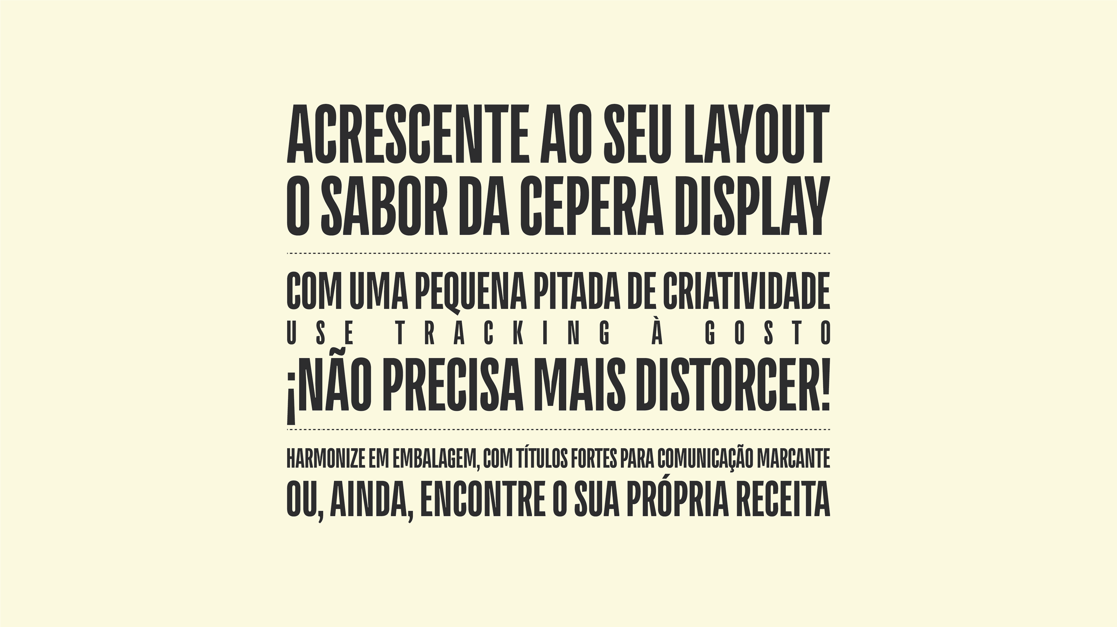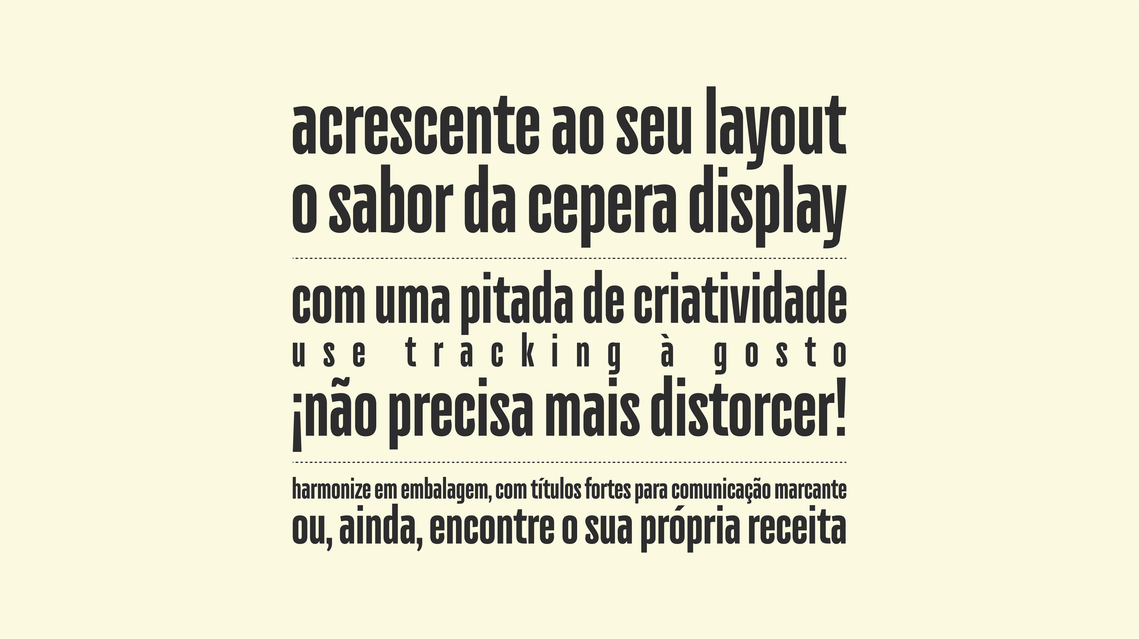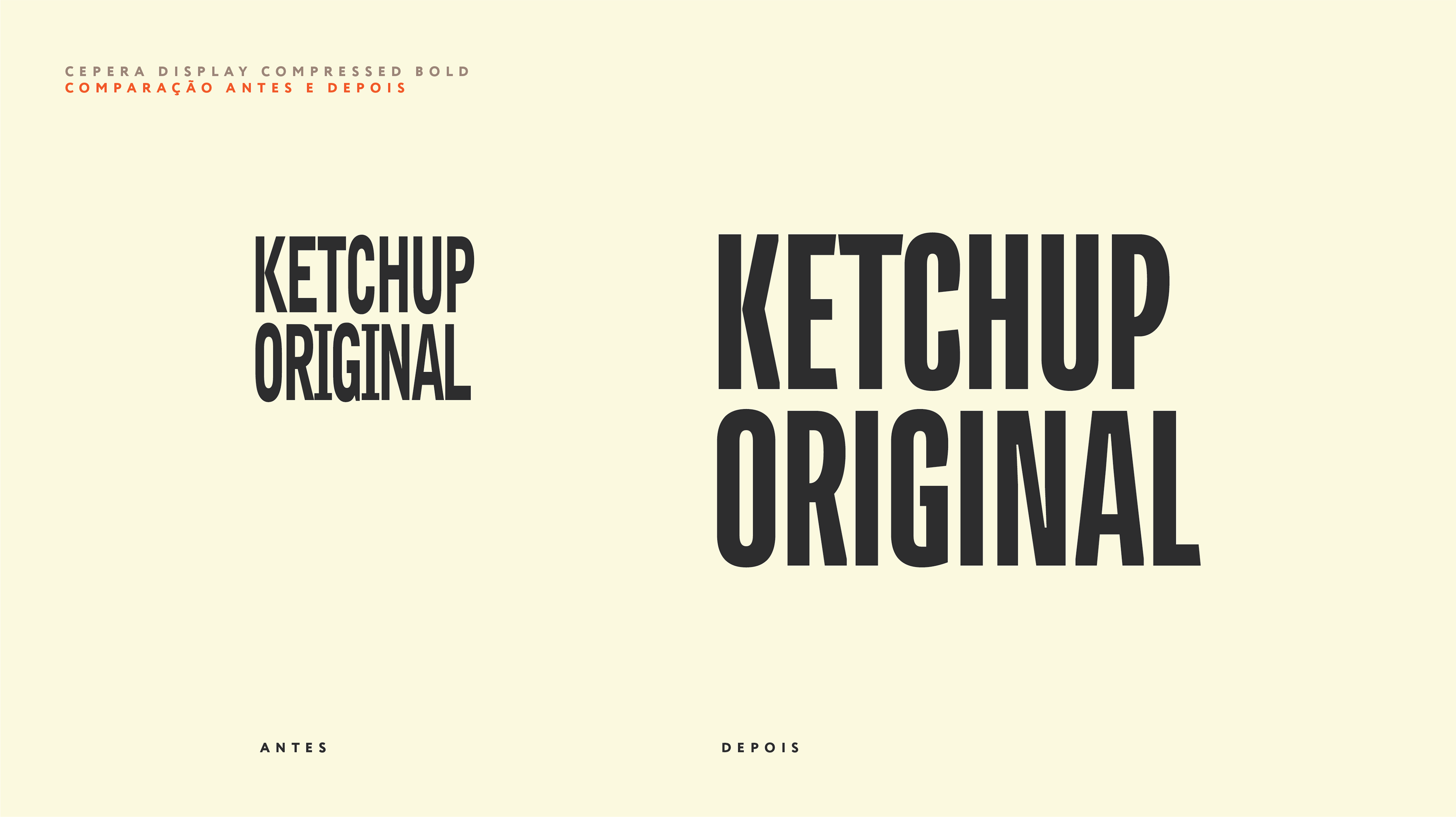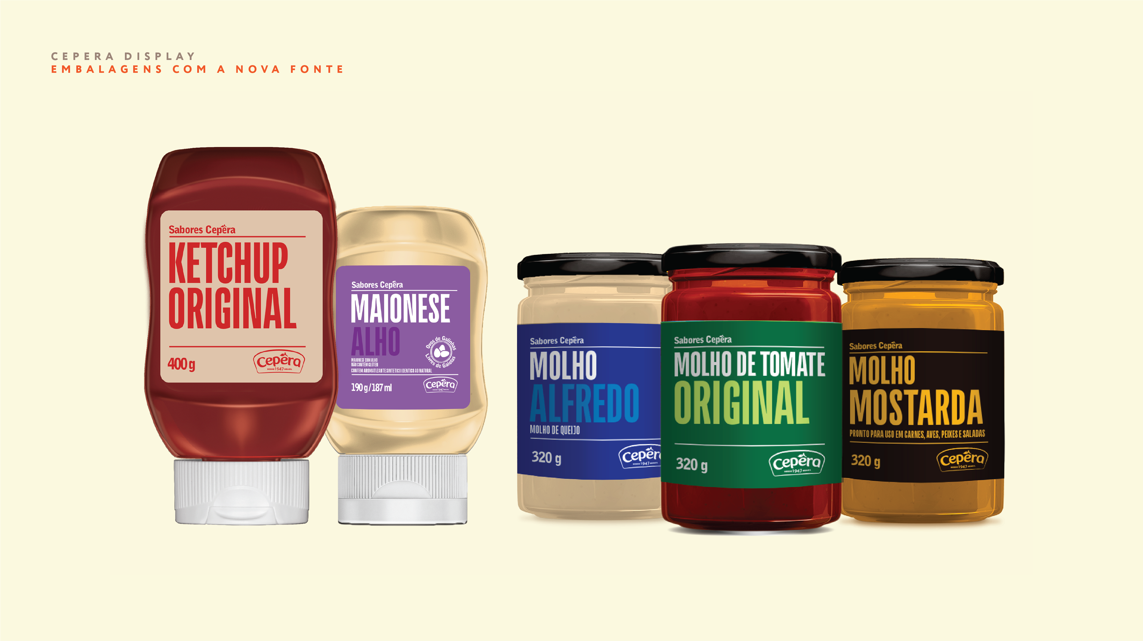 Fonte tipográfica de estilo sem serifa grotesca e compressed, customizada para as embalagens da linha de molhos especiais da Cepêra Alimentos. Com a agência 100 por Cento Design.