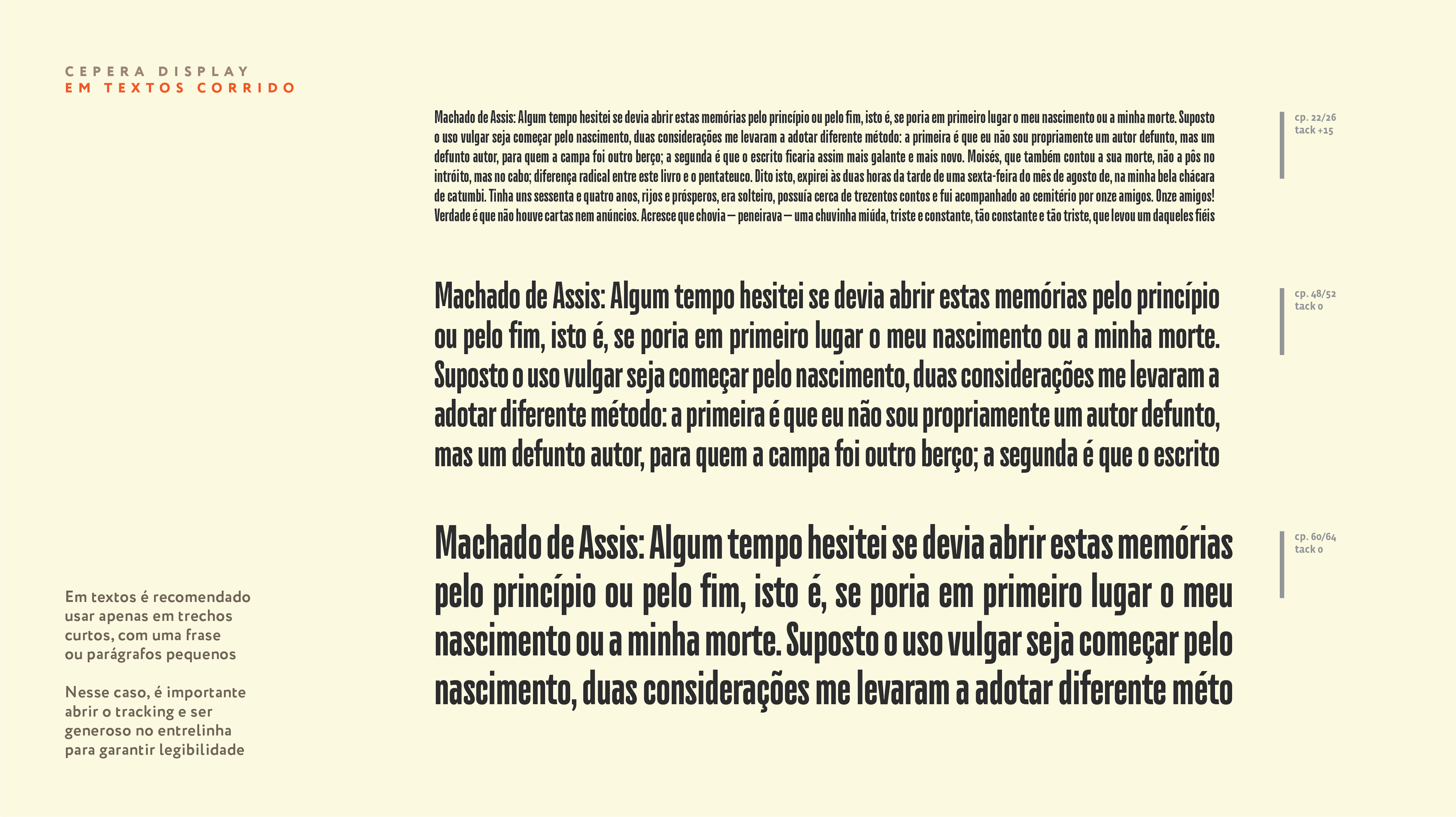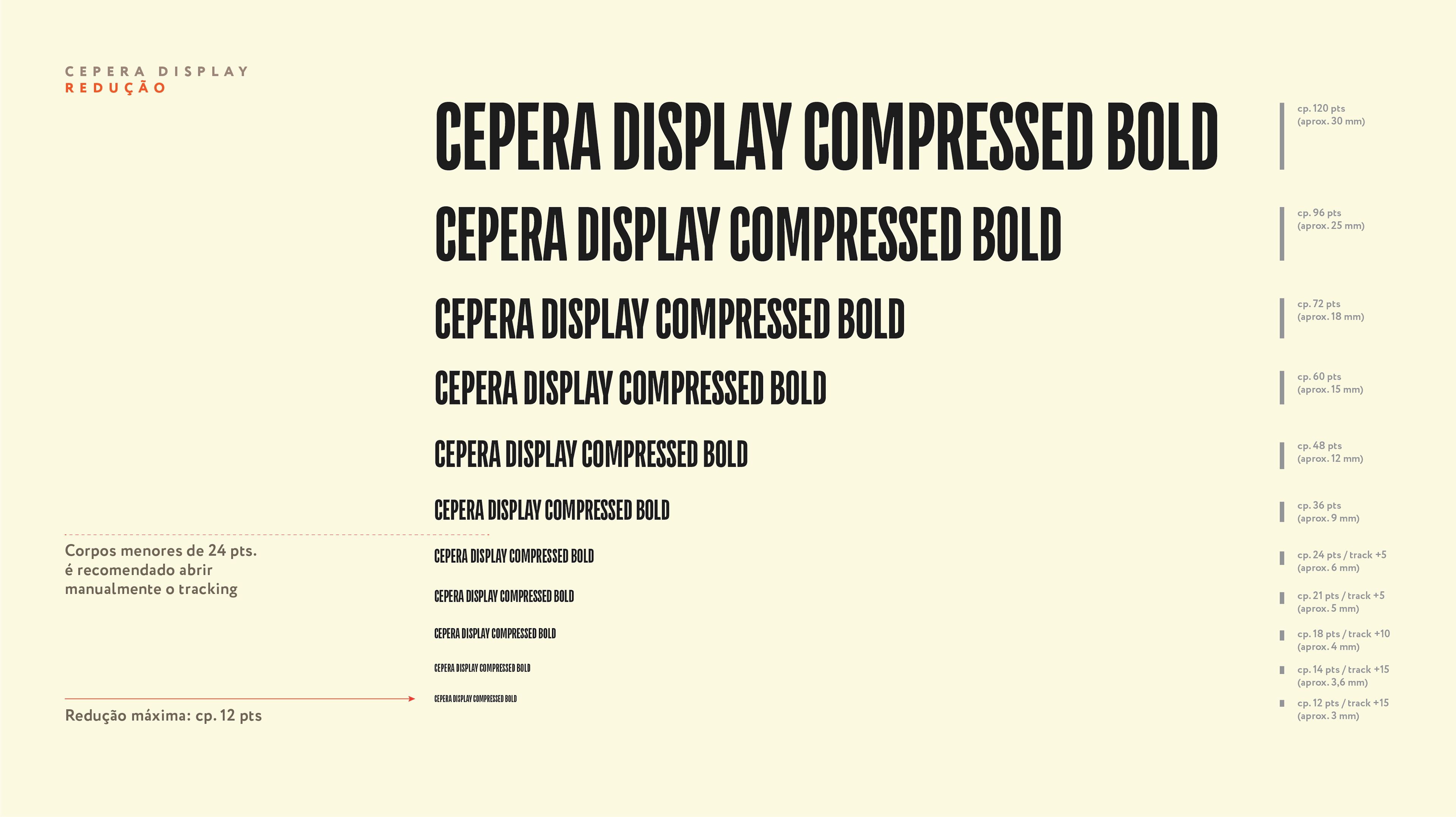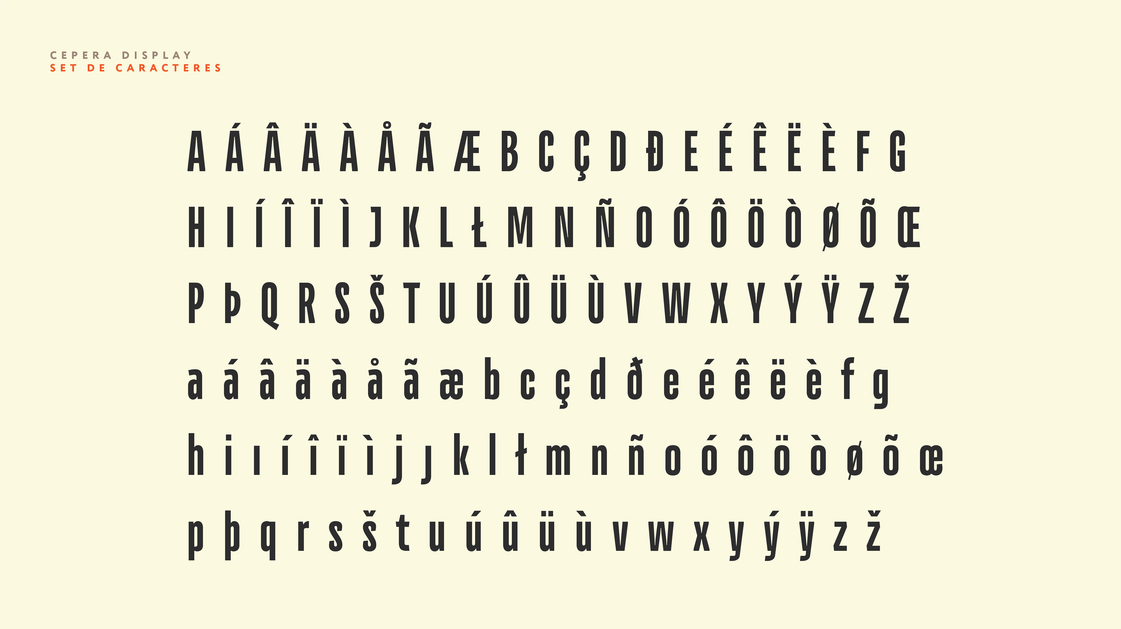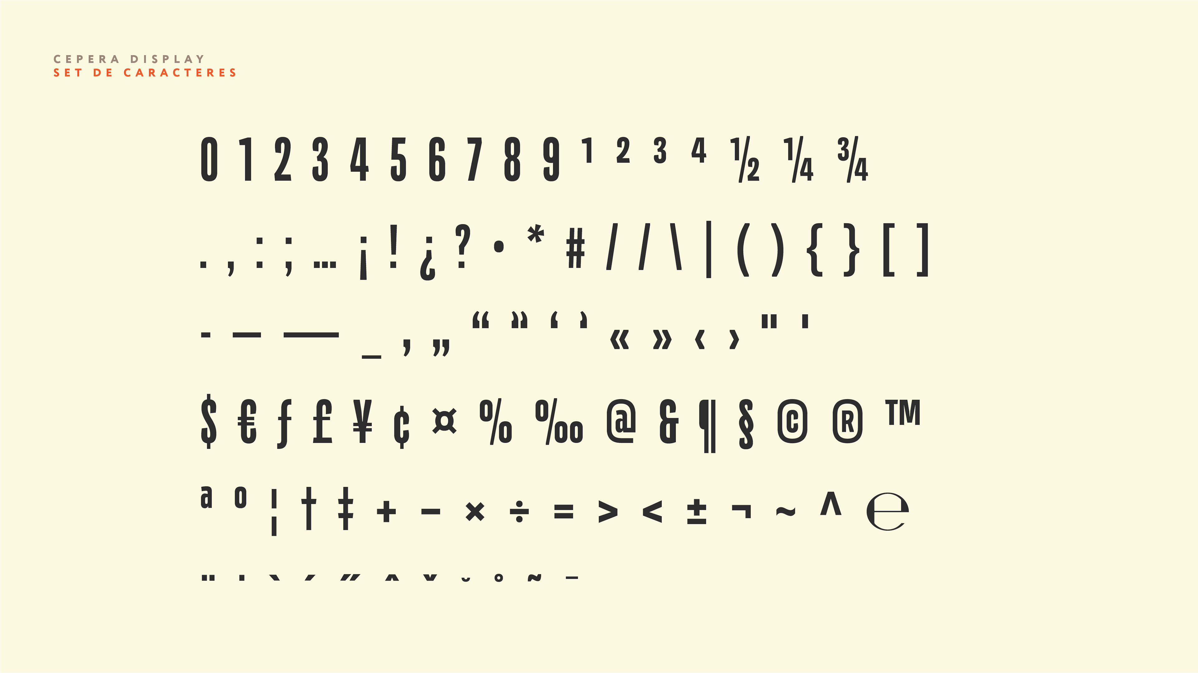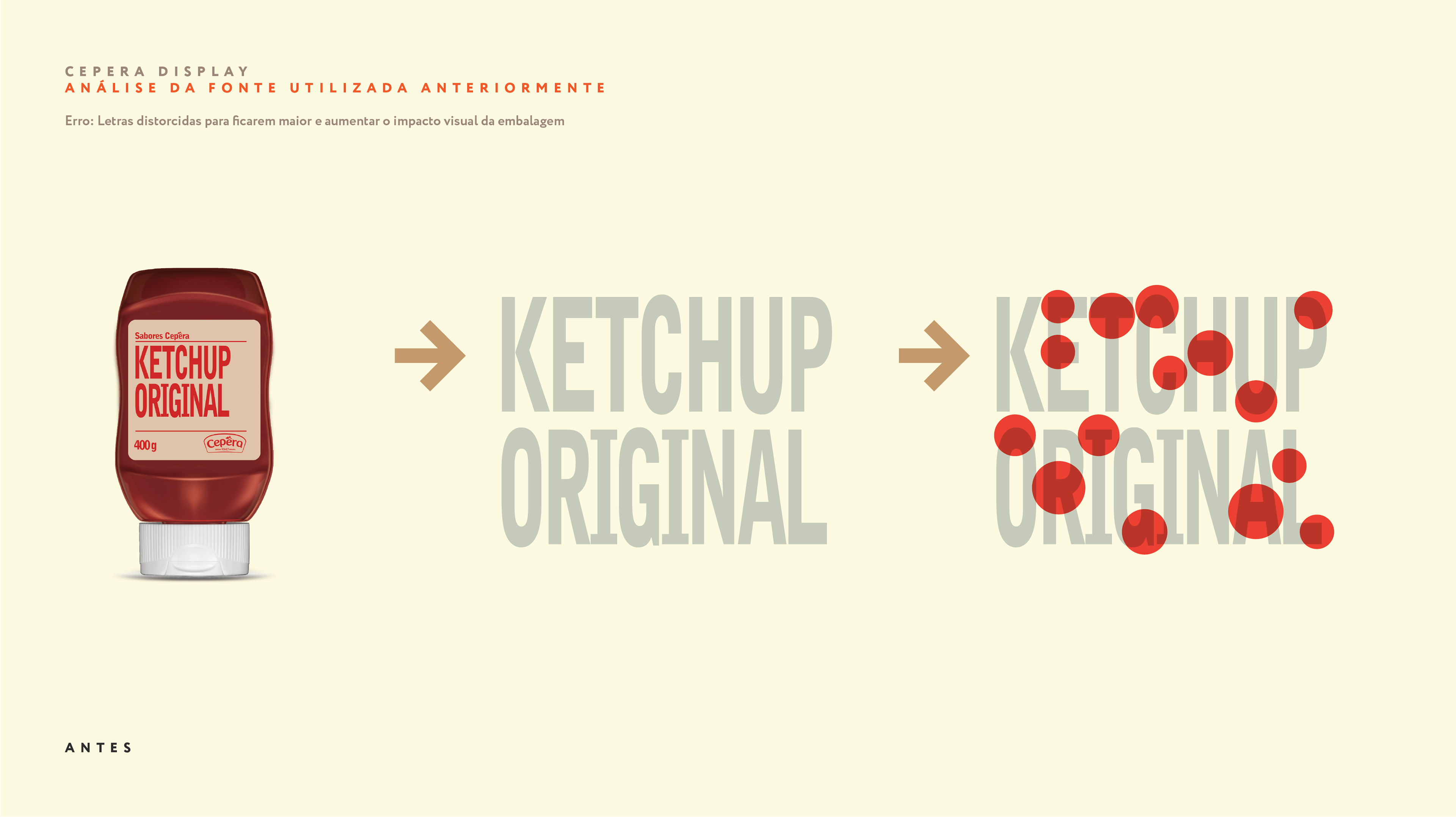 Fonte tipográfica de estilo sem serifa grotesca e compressed, customizada para as embalagens da linha de molhos especiais da Cepêra Alimentos. Com a agência 100 por Cento Design.