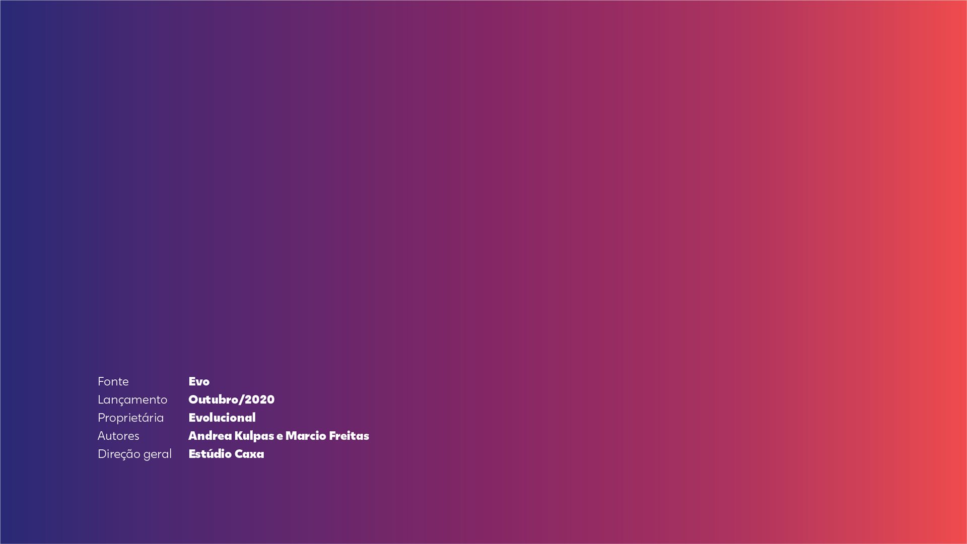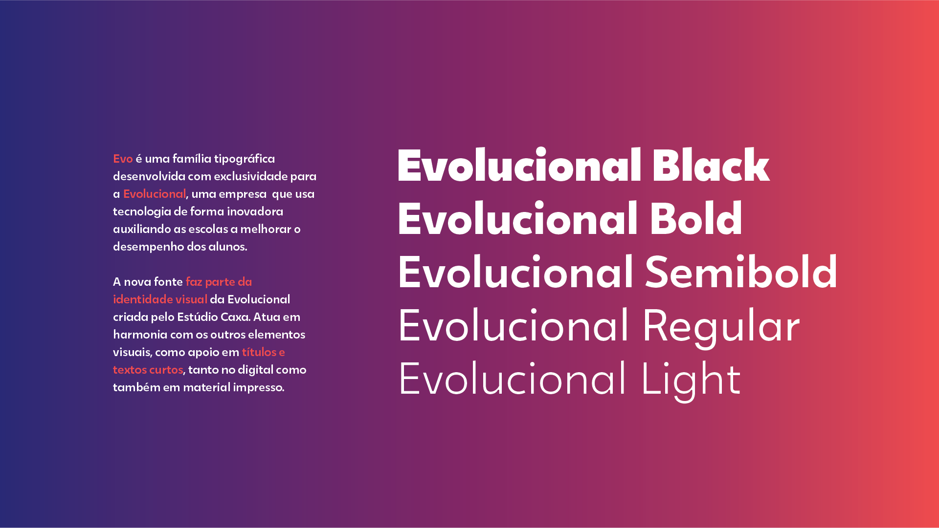Tipografia institucional com 5 pesos desenvolvida para o nova identidade da empresa Evolucional.Foi pensada para aplicação tanto em impressos como em dispositivos digitais. Com Andrea Kulpas. Direção Estúdio Caxa.